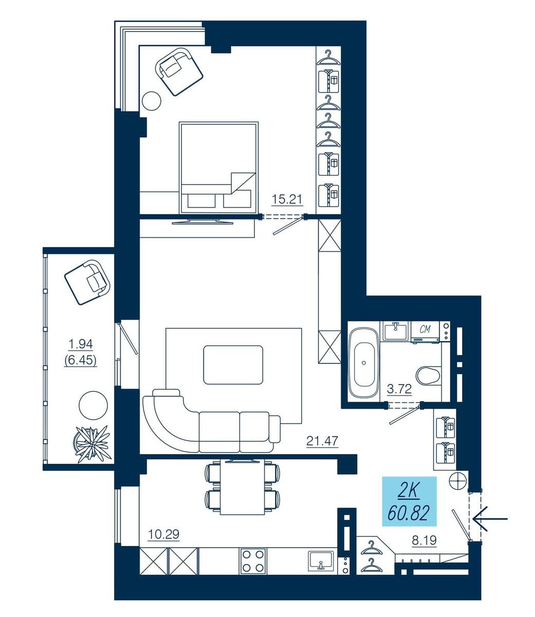 2-комнатная квартира, 60.82 М2