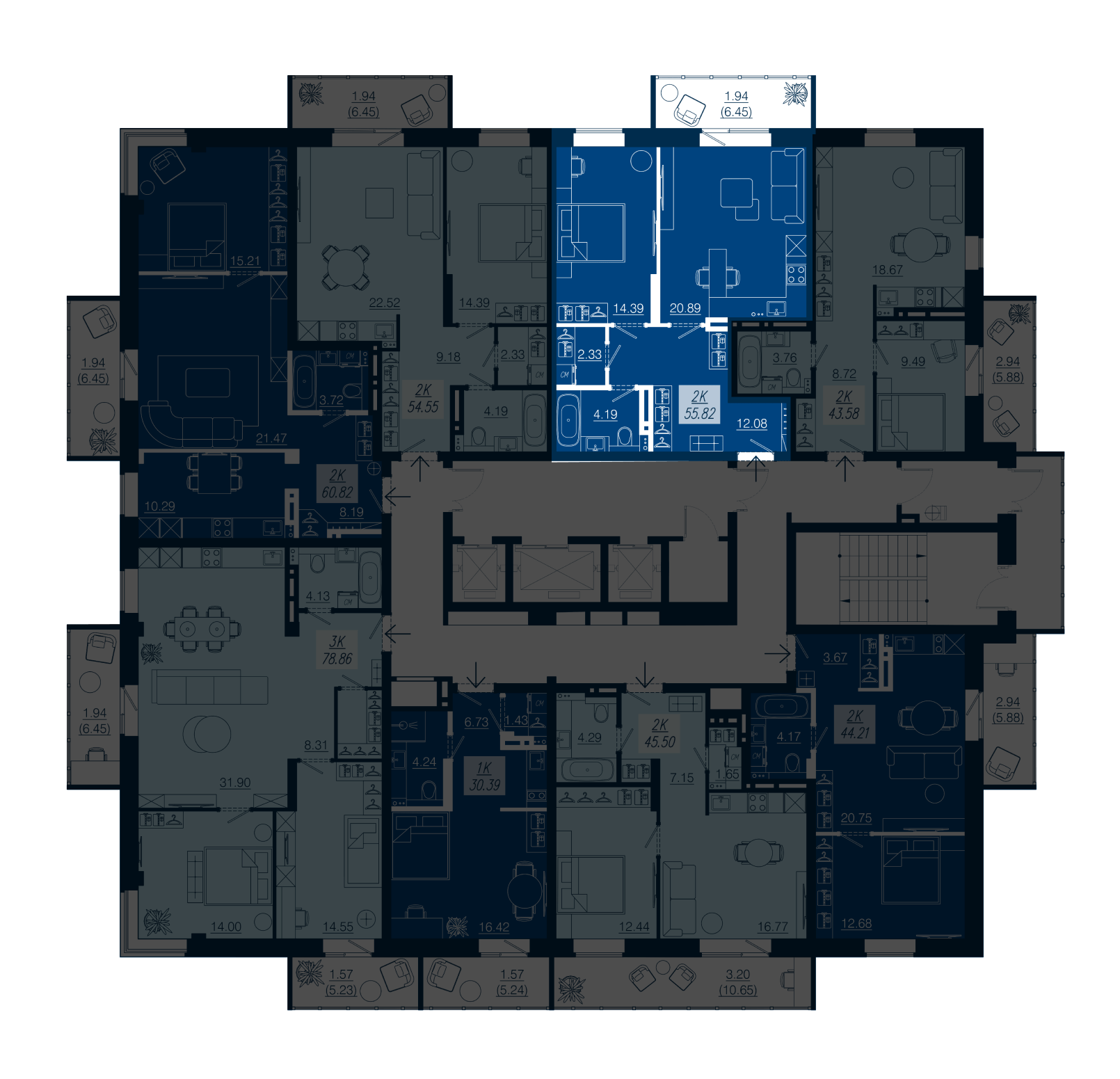 2-комнатная евроформата. Прихожая с расширенными возмоностями организовать места хранения и поставифть пуфик у входа. Отдельная гардеробная с лондри. Гостиная 21 м2 имеет французское окно с выходом на балкон. Отдельная спальня 14,39 м2.