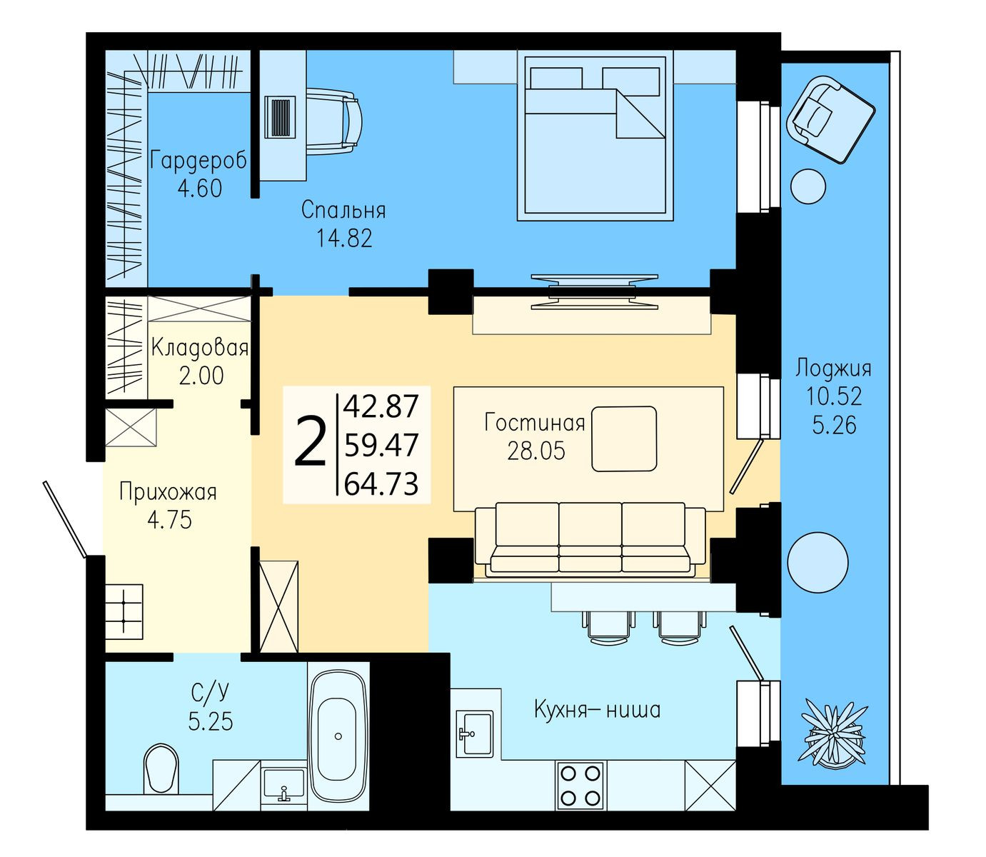 2-комнатная квартира, 64.73 М2