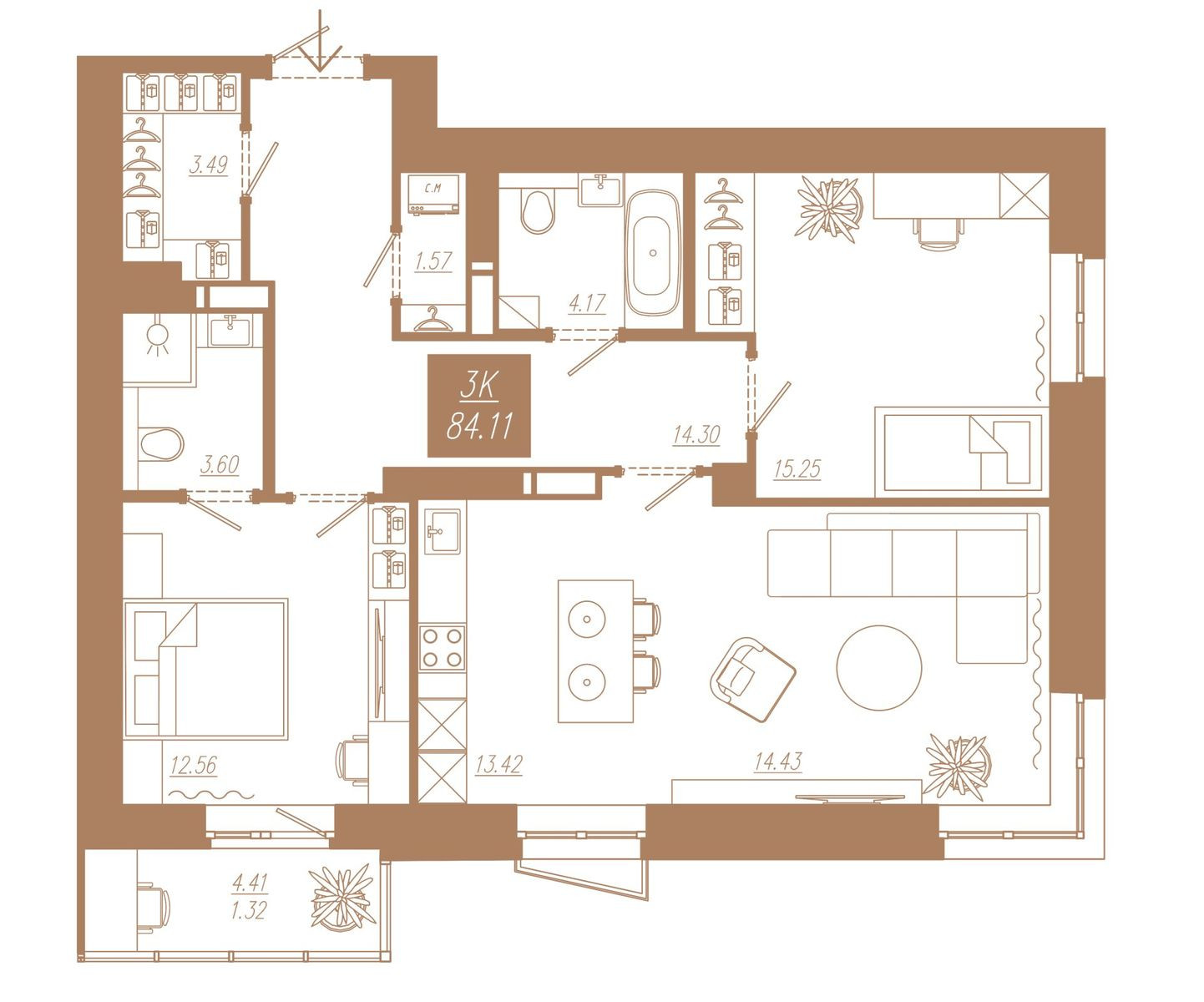 Умопомрачительная планировка 3-комнатной квартиры 84,11 м2 с 2-мя санузлами и видом на Енисей. Гареробная 3,49 м2 на входе. Постирочная комната 1,6 м2 с водопроводом и электричеством позволит разместить стиральную машину, бытовую химию и домашние принадлежности. Мастер-спальня 12,56 м2 с продуманной планировкой для хранения и размещения туалетного столика имеет собственную душевую и большое окно с выходом на балкон. Детская комната 15,25 м2 с простенками для встроенных шкафов удалена от родительской спальни – что дает еще больше комфорта и приватности. Роскошная кухня-гостиная 28 м2, где всегда будет много света: здесь есть угловое пейзажное окно и французский балкончик, который будет утопать в цветах. Такое пространство подойдёт для события любого формата: встречи с семьей и особые даты, светские вечера или воскресные бранчи.