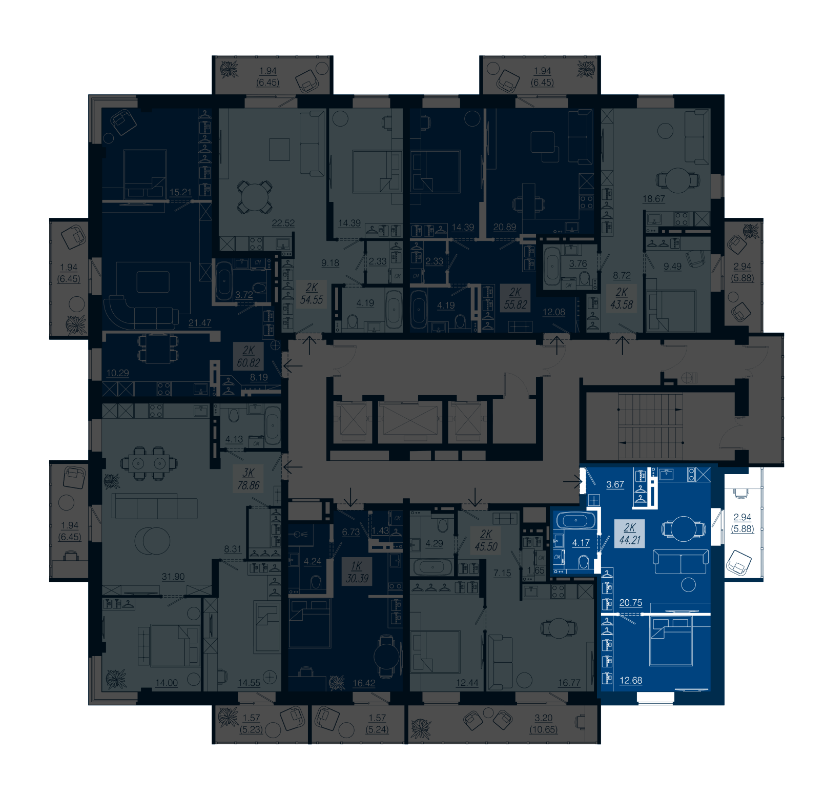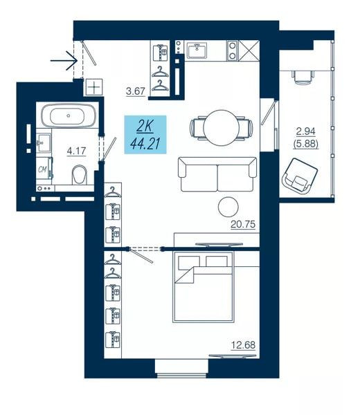 Компактная 2-комнатная. Прихожая 3,67 м2 с нишей для встроенного шкафа. Кухня-гостиная 21 м2 с французским окном! Кухонный фронт располагается в специальной нише – рядом с обеденной группой и выходом в лоджию. Отдельная спальня 12,7 м2. Планировка и дверные проемы спроектированы для эргономичной расстановки мягкой мебели, кровати и систем хранения.